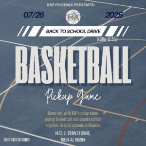 BSP Phoenix is hosting a Back to School Pickup Basketball Game and supply drive! Join us on July 26th from 9:30a–12:30p at 1455 S. Stapley Dr, Mesa AZ for a fun morning of community hoops and giving back. Bring your game and a backpack full of school supplies to support local Phoenix students!